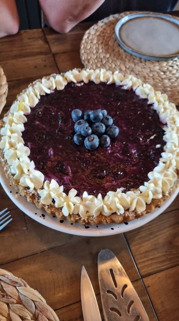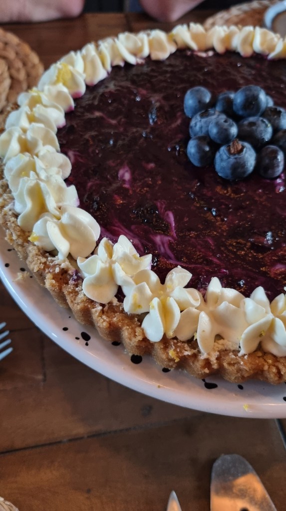 8. FOR THE DECORATION ON TOP MIX DOUBLE CREAM WITH ICING SUGAR AND PIPE IT ON AND IF YOU HAVE ANY LEFTOVER BLUEBERRIES YOU CAN ADD THEM ON TOP TOO
