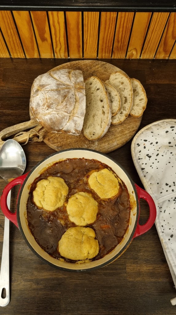 KEEP ADDING GRAVY GRANULES SLOWLY TILL THE STEW BECOMES THICKER AND THEN TURN OFF THE HEAT. - ADD THE STEW TO A CASSEROLE DISH AND ROLL THE DOUGH UP INTO BALLS AND PUT THEM ON TOP OF THE STEW. BAKE IN THE OVEN FOR 25-30 MINUTES ON 170° FAN)