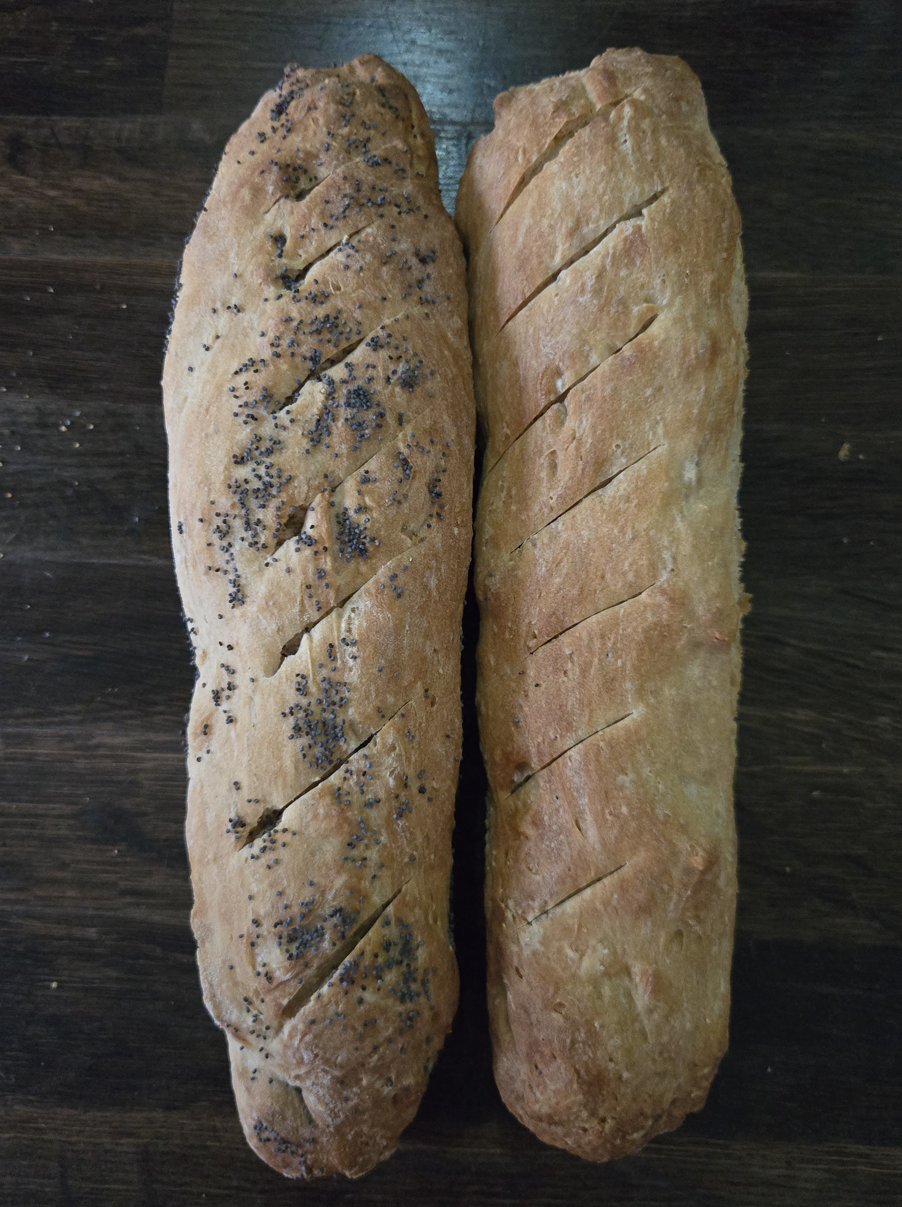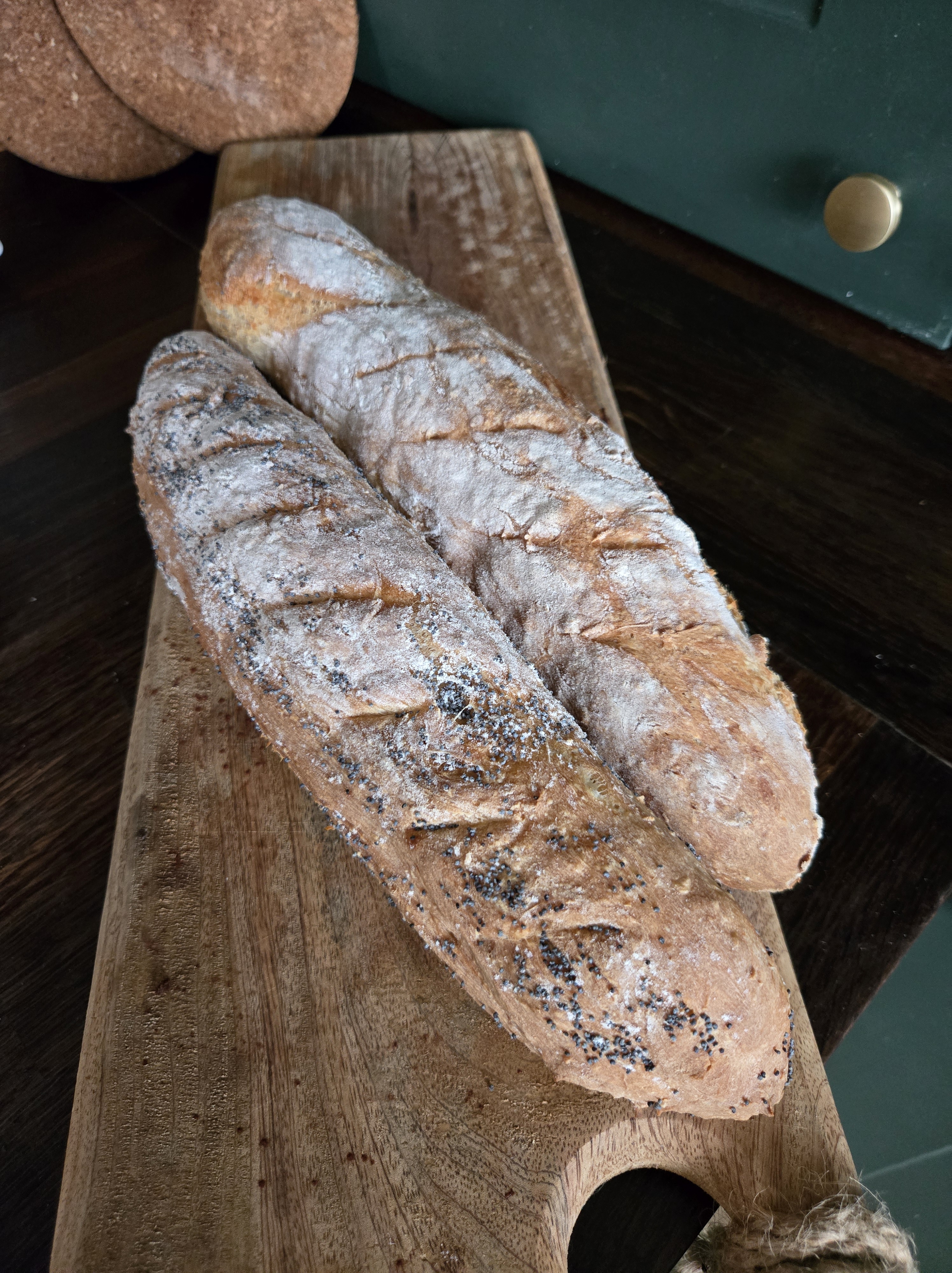 5.THE DOUGH WILL BE SUPER STICKY AND YOU WANT TO HANDLE IT AS LITTLE AS POSSIBLE, SO GENTLY TIP IT OUT ONTO A FLOURED SURFACE (WET YOUR HANDS AS THIS WILL HELP WITH THE STICKING). SPRINKLE WITH FLOUR AND DIVIDE INTO TWO AND THEN SHAPE THE DOUGH INTO TWO LONG SHAPED BAGUETTES, AND PLACE ONTO THE LINED BAKING TRAY AND LEAVE TO RISE FOR A FURTHER 30 MINUTES WHILST THE OVEN IS HEATING.