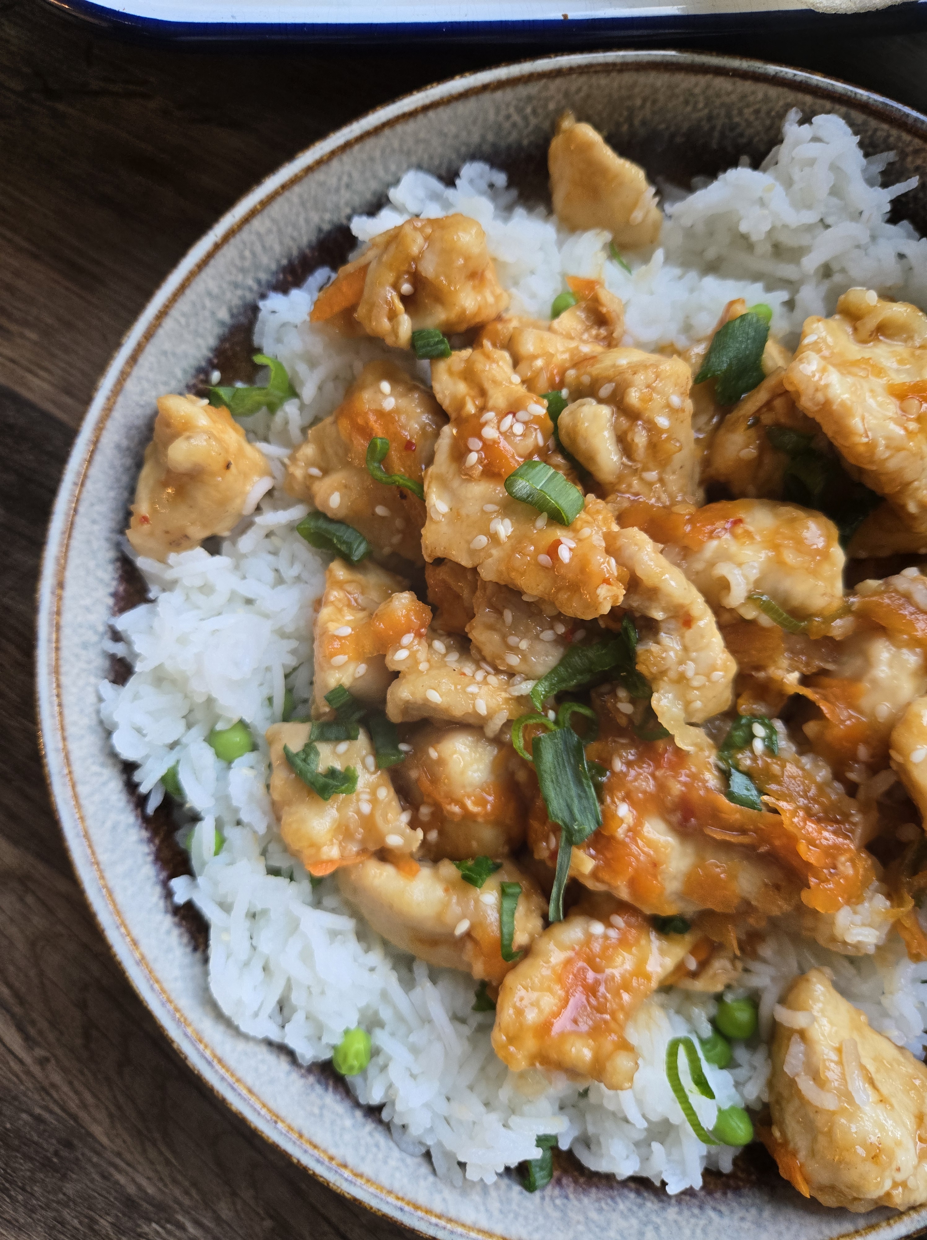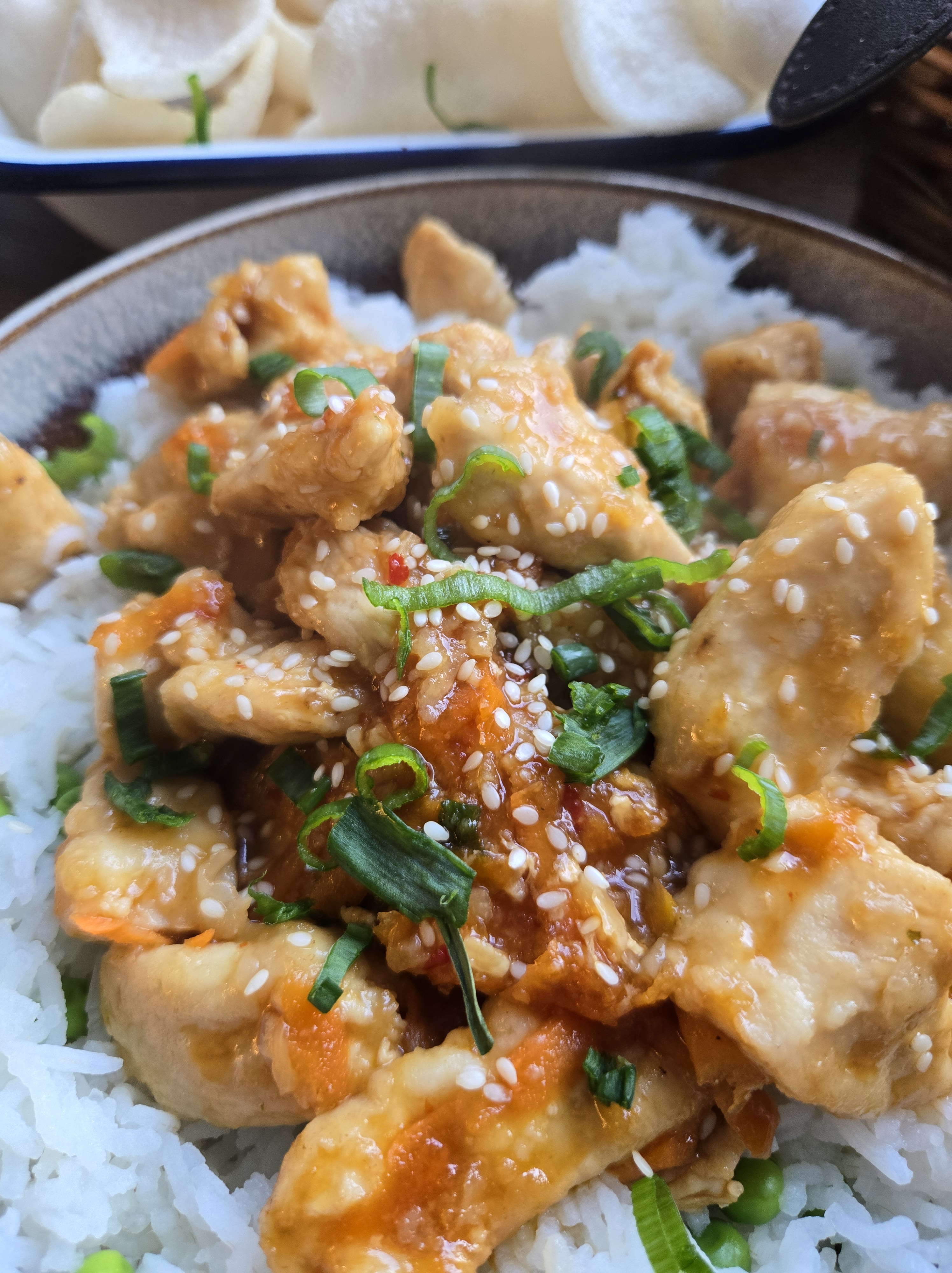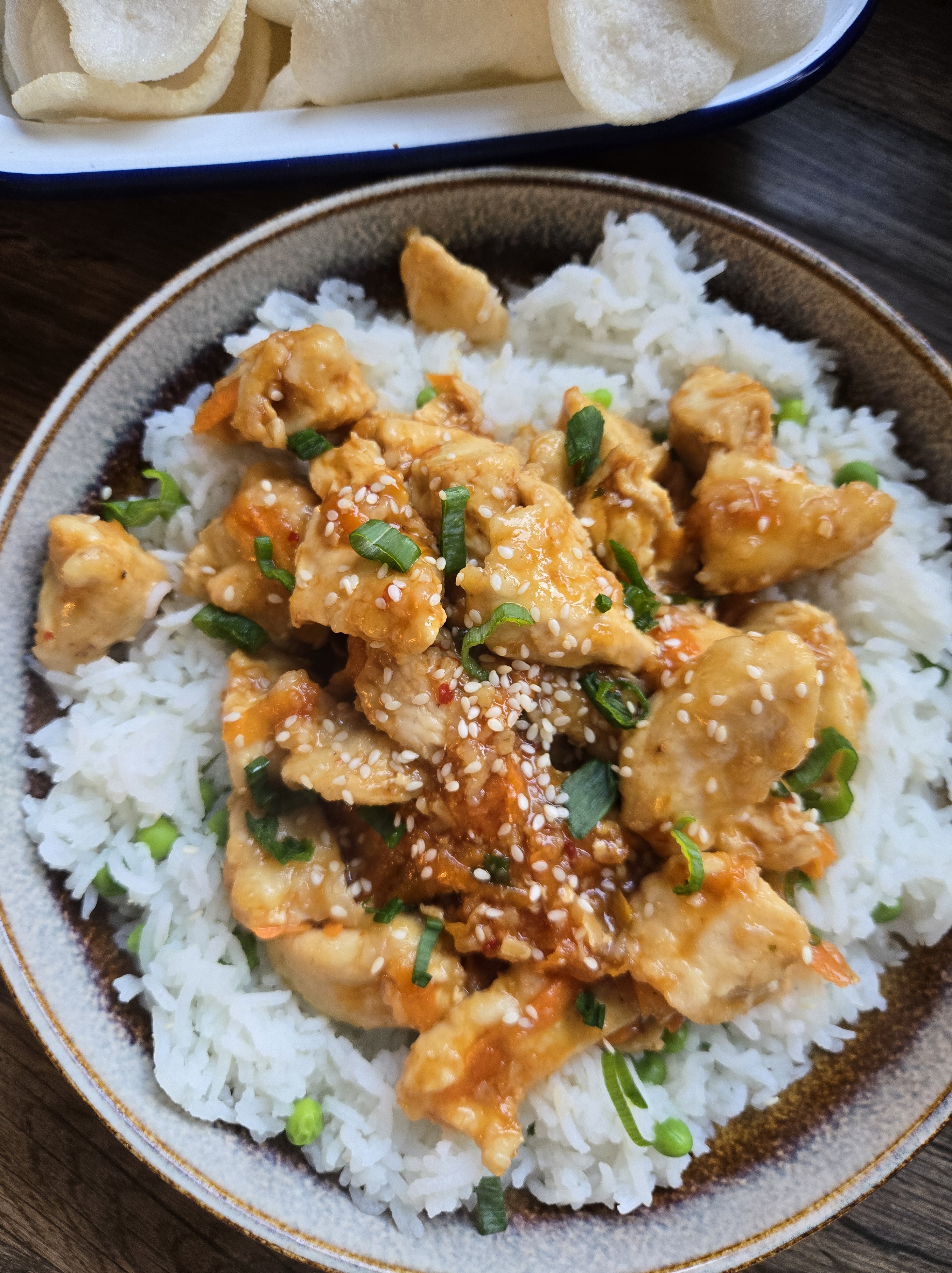 6. DISH UP THE RICE AND PEAS. ADD ON THE CHICKEN MIX. SPRINKLE OVER SPRING ONION AND SESAME SEEDS.
