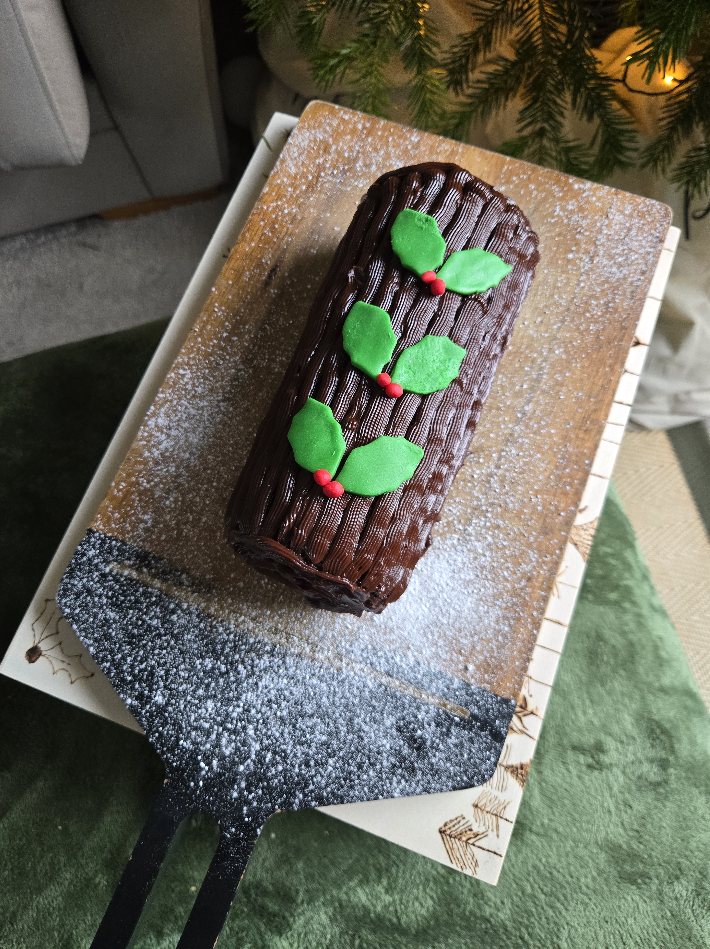 IF YOU DON’T HAVE AN ICING BAG AND NOZZLE JUST SPREAD ON THE GANACHE AND USE A FORK TO MAKE THE PATTERN - DECORATE HOWEVER YOU WISH. I OPTED FOR FONDANT ICING HOLLY AND BERRIES