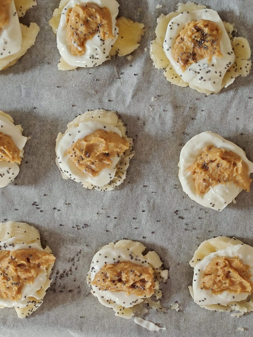 ADD A DOLLOP OF NATURAL YOGHURT FOLLOWED BY A SMALLER SCOOP OF PEANUT BUTTER AND SPRINKLE WITH SEEDS!!