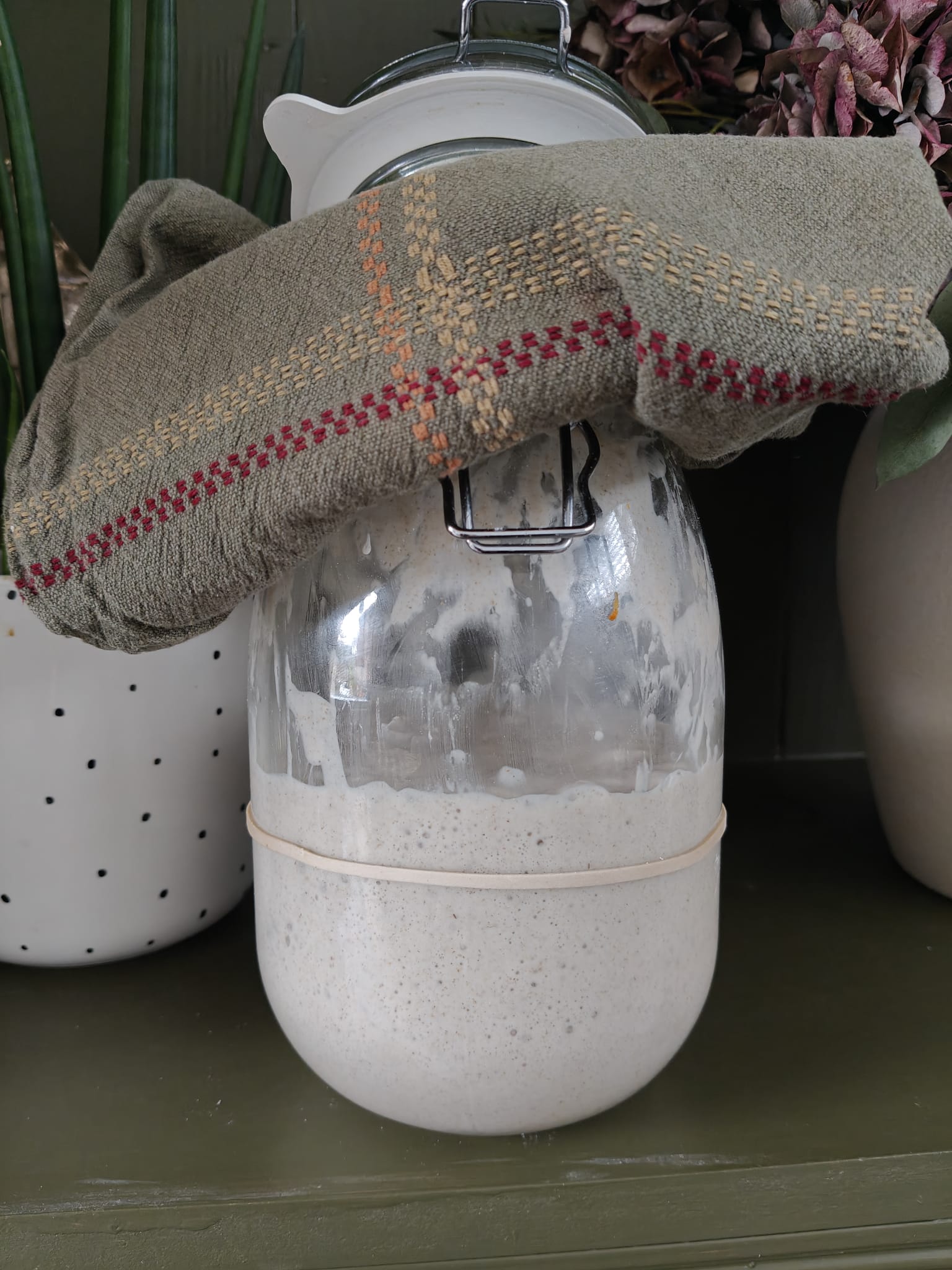 MEASURE OUT 100G FLOUR AND 100G WATER AND MIX THEM TOGETHER IN A JAR. SCRAPE DOWN THE MIXTURE FROM THE SIDES AS MUCH AS POSSIBLE. COVER OVER WITH KITCHEN ROLL OR TEA TOWEL AND SET ASIDE TO REST FOR 24 HOURS. ADD THE ELASTIC BAND OR STRING ROUND THE OUTSIDE OF THE JAR TO USE AS A MARKER TO MEASURE THE GROWTH