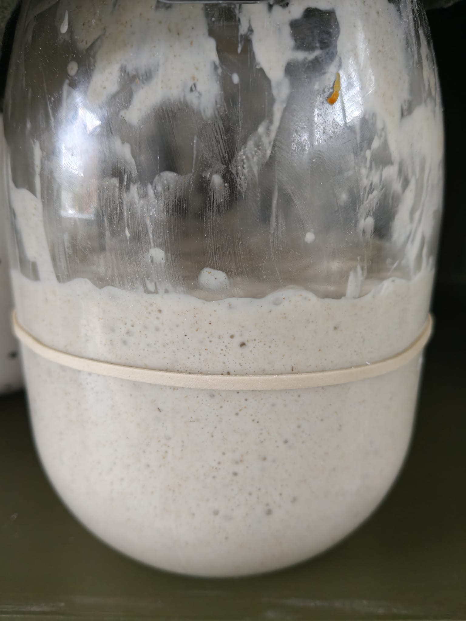 THEN ADD A FURTHER 100G FLOUR AND 100G WATER AND MIX WELL. SCRAPE DOWN THE MIXTURE FROM THE JAR, COVER AND SET ASIDE TO REST FOR 24 HOURS. ADD THE ELASTIC BAND AS A MARKER