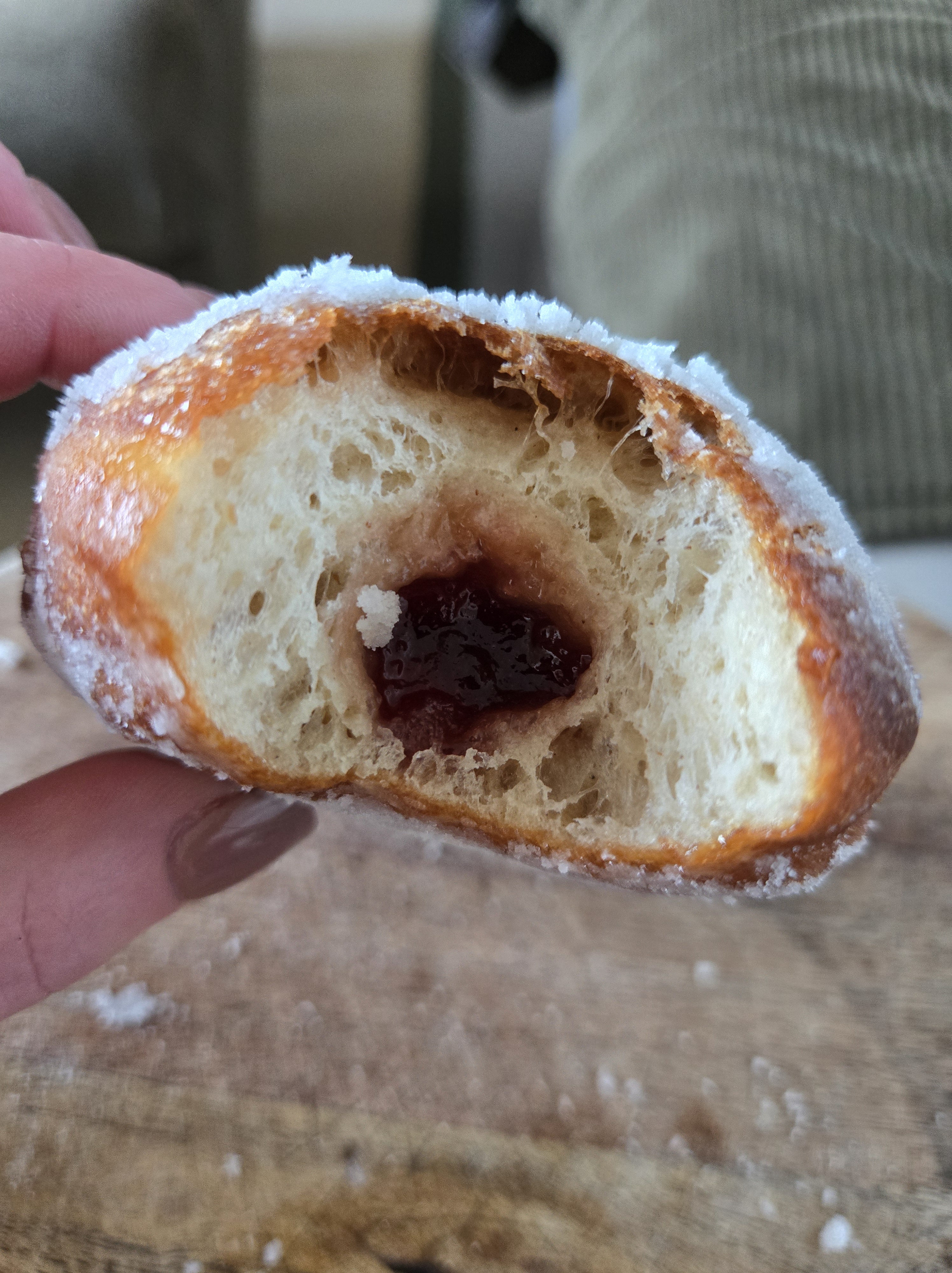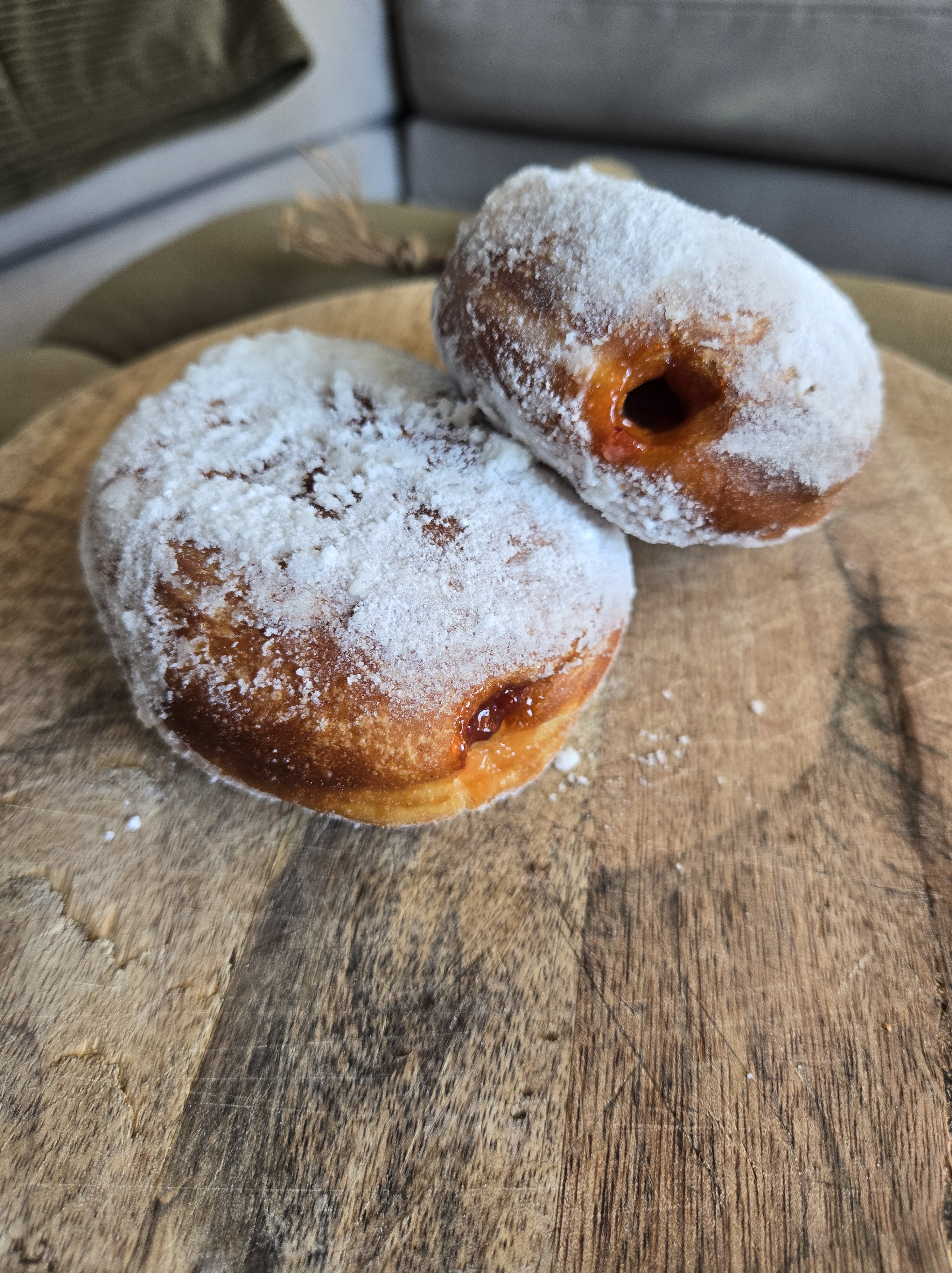YOU WANT TO DIP THEM IN SUGAR AS SOON AS THEY COME OUT THE PAN. USE EITHER SUGAR ON IT’S OWN OR I PREFER A MIX OF SUGAR AND ICING SUGAR. I COATED MINE IN BOTH AND THEN WAITED FOR THEM TO COOL SLIGHTLY BEFORE INJECTING STRAWBERRY JAM FILLING INTO THE MIDDLE! DELICIOUS!!