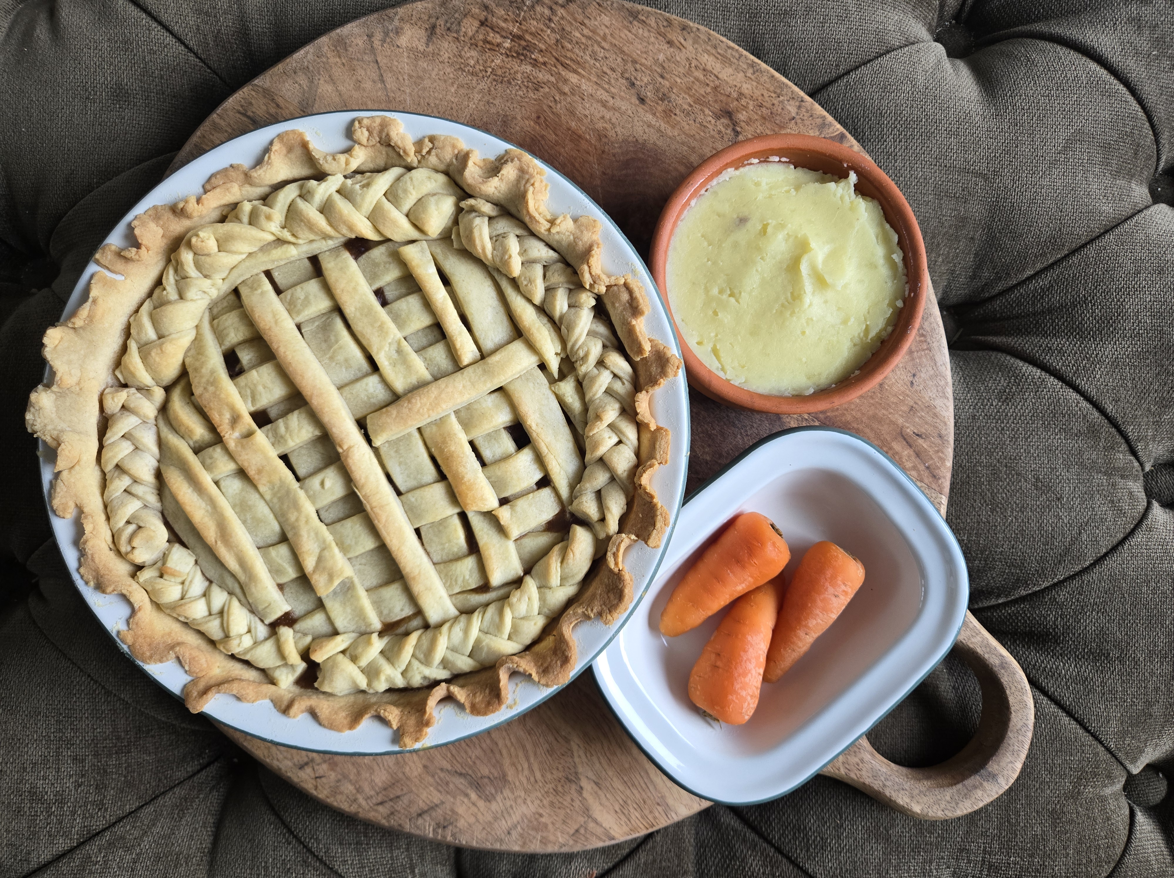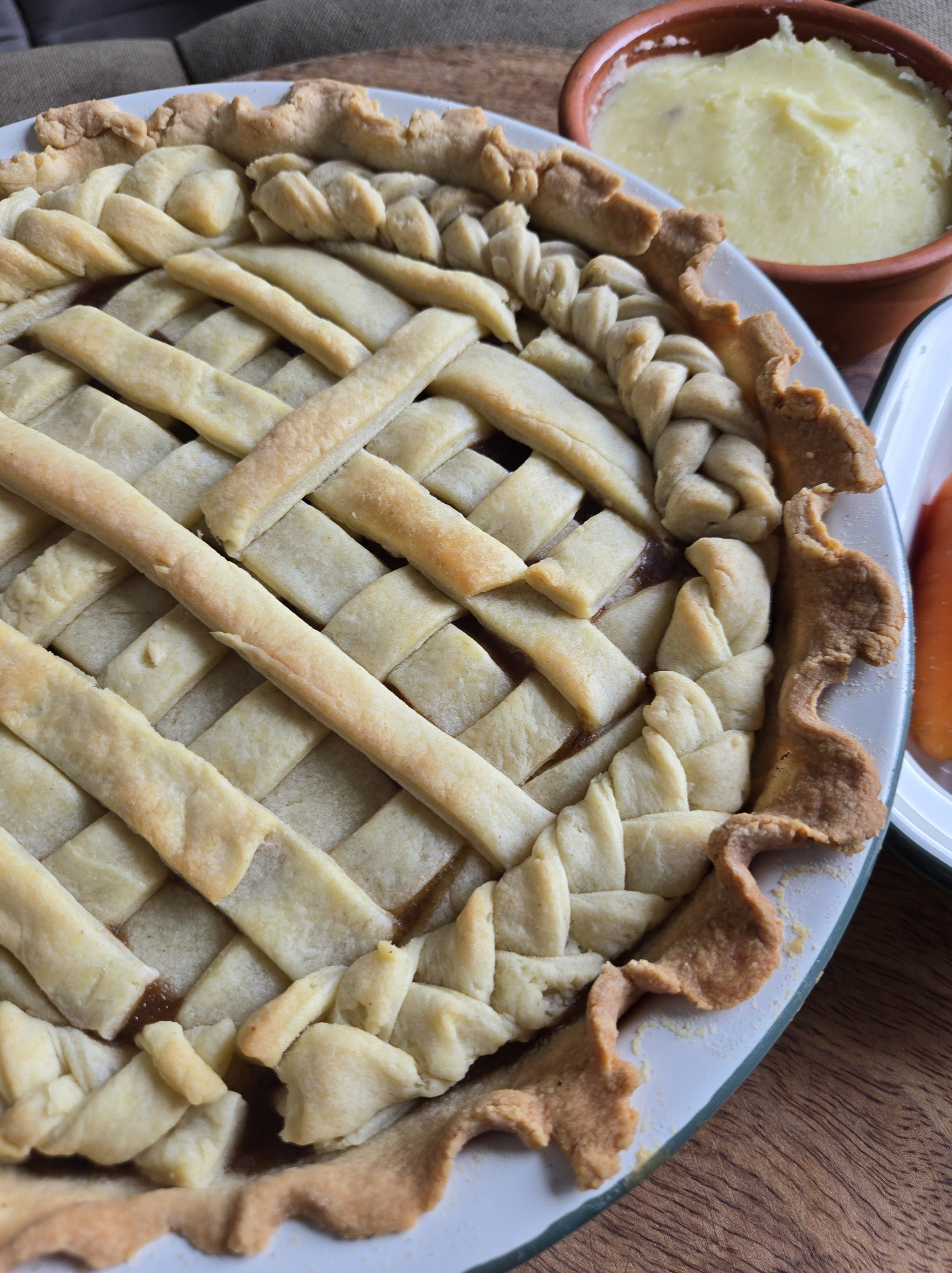 NOW DECORATE THE TOP! EITHER 1 SHEET OVER THE WHOLE TOP OR STRIPS OF PASTRY TO CREATE A LATTICE EFFECT. I PLAITED PASTRY FOR THE EDGE TOO BUT YOU CAN DO IT HOWEVER YOU LIKE!
