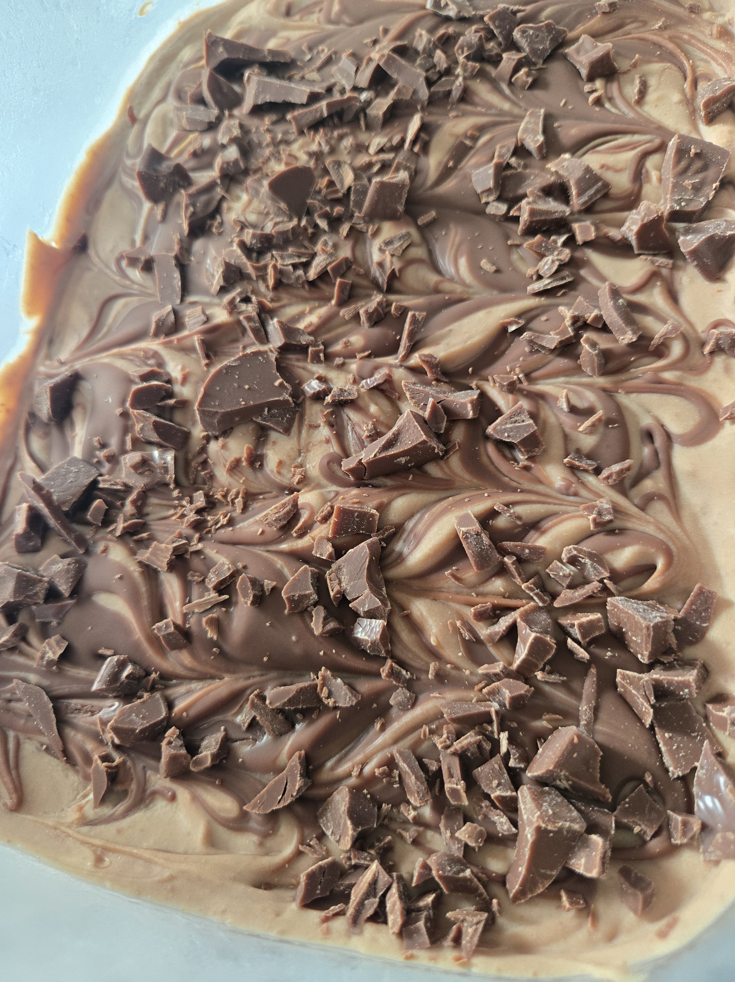 OVER THE REMAINING MELTED CHOCOLATE AND SWIRL IT AROUND USING A COCKTAIL STICK. CHOP UP THE REMAINING CHOCOLATE PIECES AND SPRINKLE THEM ON THE TOP.