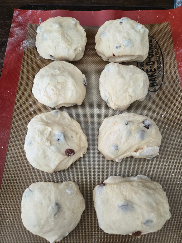 LINE A BAKING TRAY WITH BAKING PAPER. TIP OUT THE DOUGH ONTO A FLOURED SURFACE AND CUT INTO 8. ROLL THEM INTO BALL SHAPES VERY CAREFULLY AND PLACE THEM ON THE TRAY – CLOSE TOGETHER BUT NOT TOUCHING.
