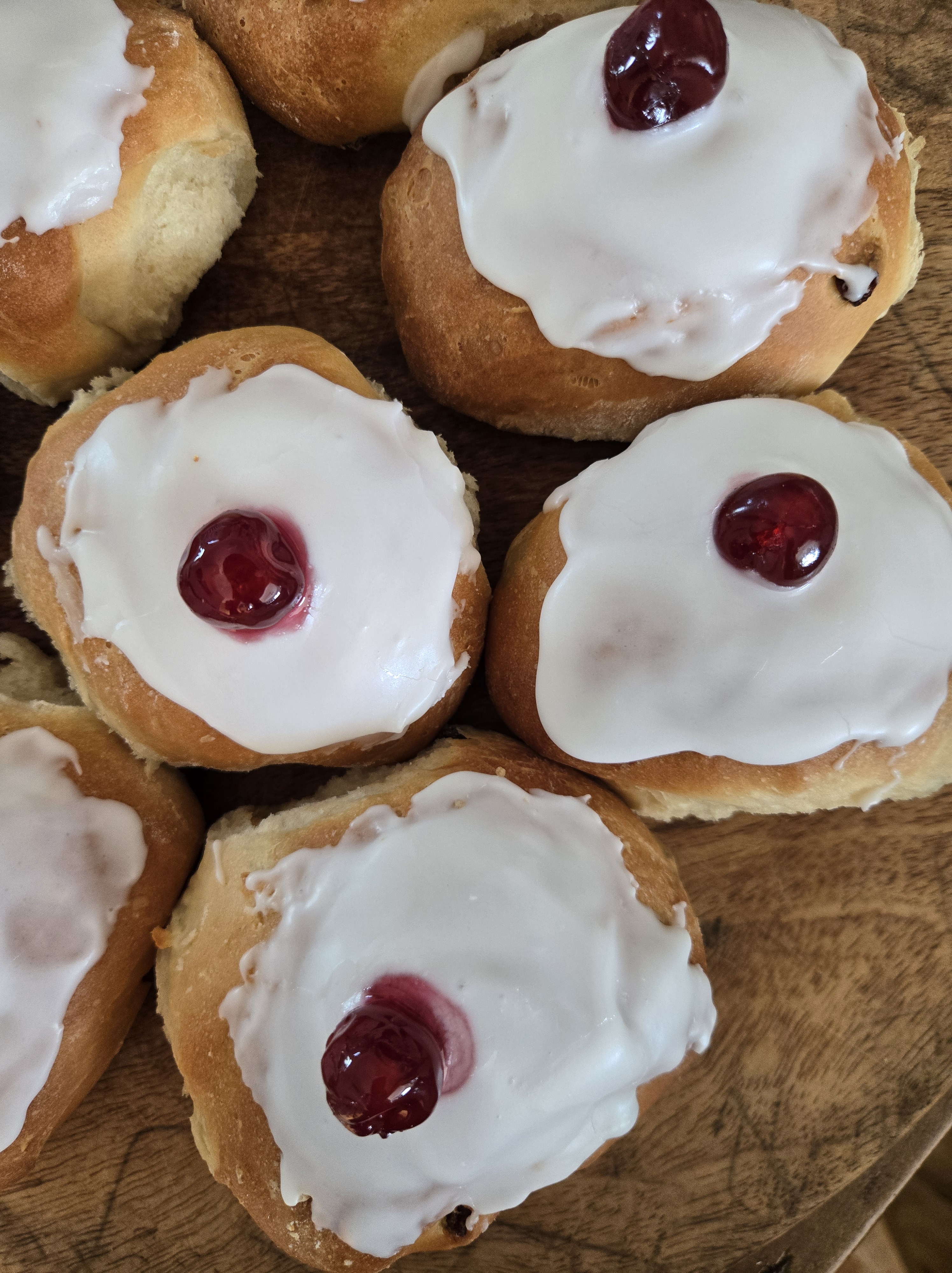 MIX ICING SUGAR WITH WATER TO A THICK YET POURABLE PASTE AND POUR ONTO THE BUNS- ADD THE CHERRIES AND ALLOW TO SET