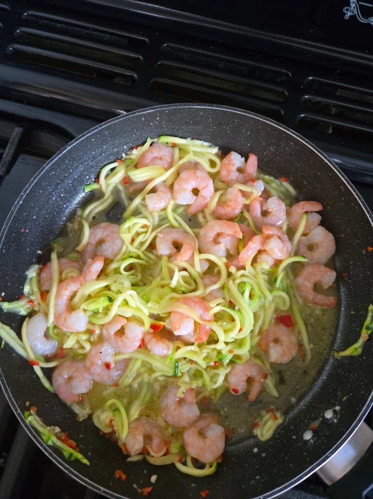 IF YOU HAVE A SPIRALIZER THEN USE THIS TO SPIRAL YOUR COURGETTE INTO SPAGHETTI. IF YOU DON’T HAVE ONE THEN YOU CAN CUT YOUR COURGETTE INTO THIN STRIPS AS POSSIBLE. I PREFER TO TAKE THE SKIN OFF MINE BUT WHICHEVER YOU PREFER!
