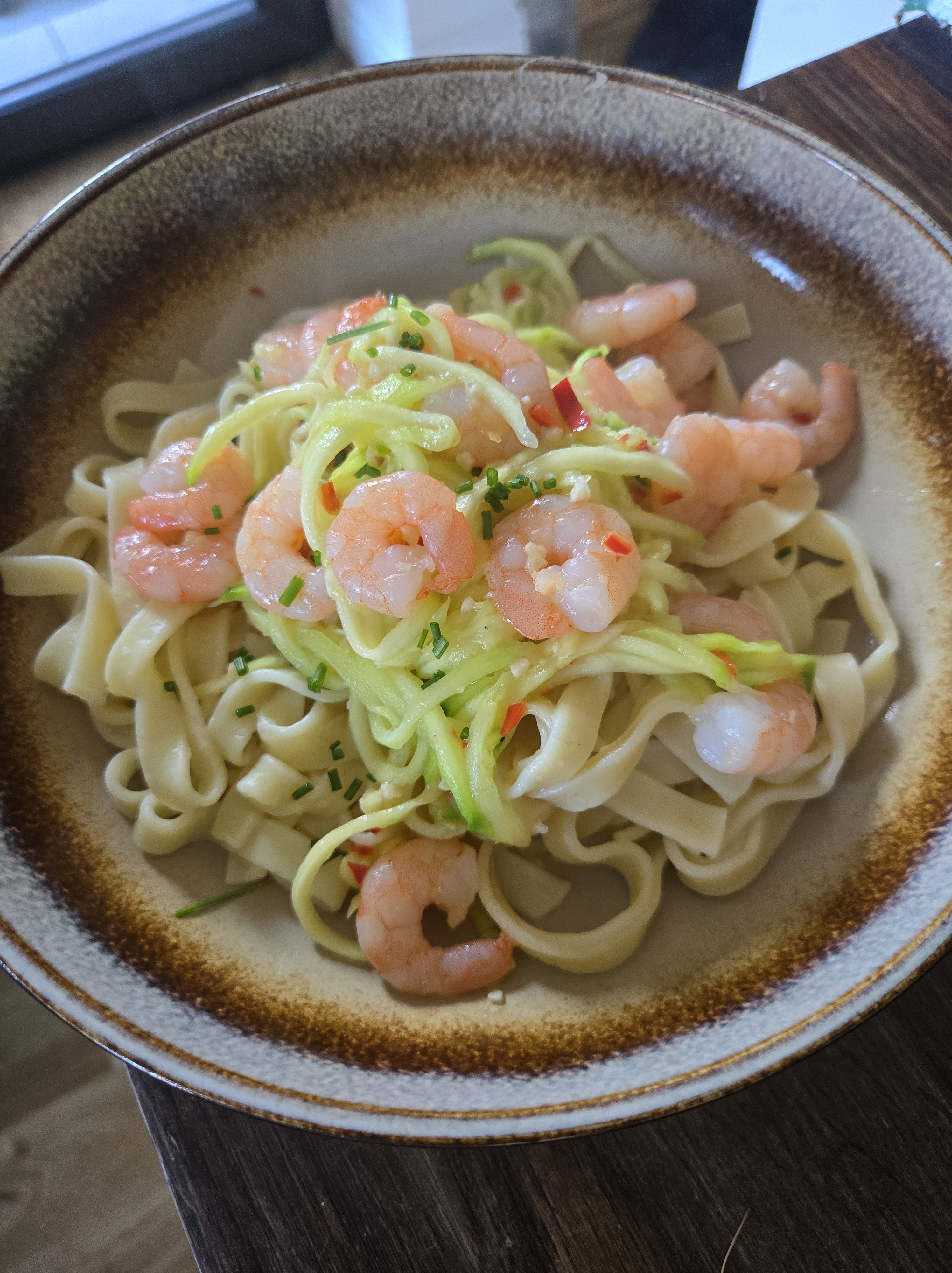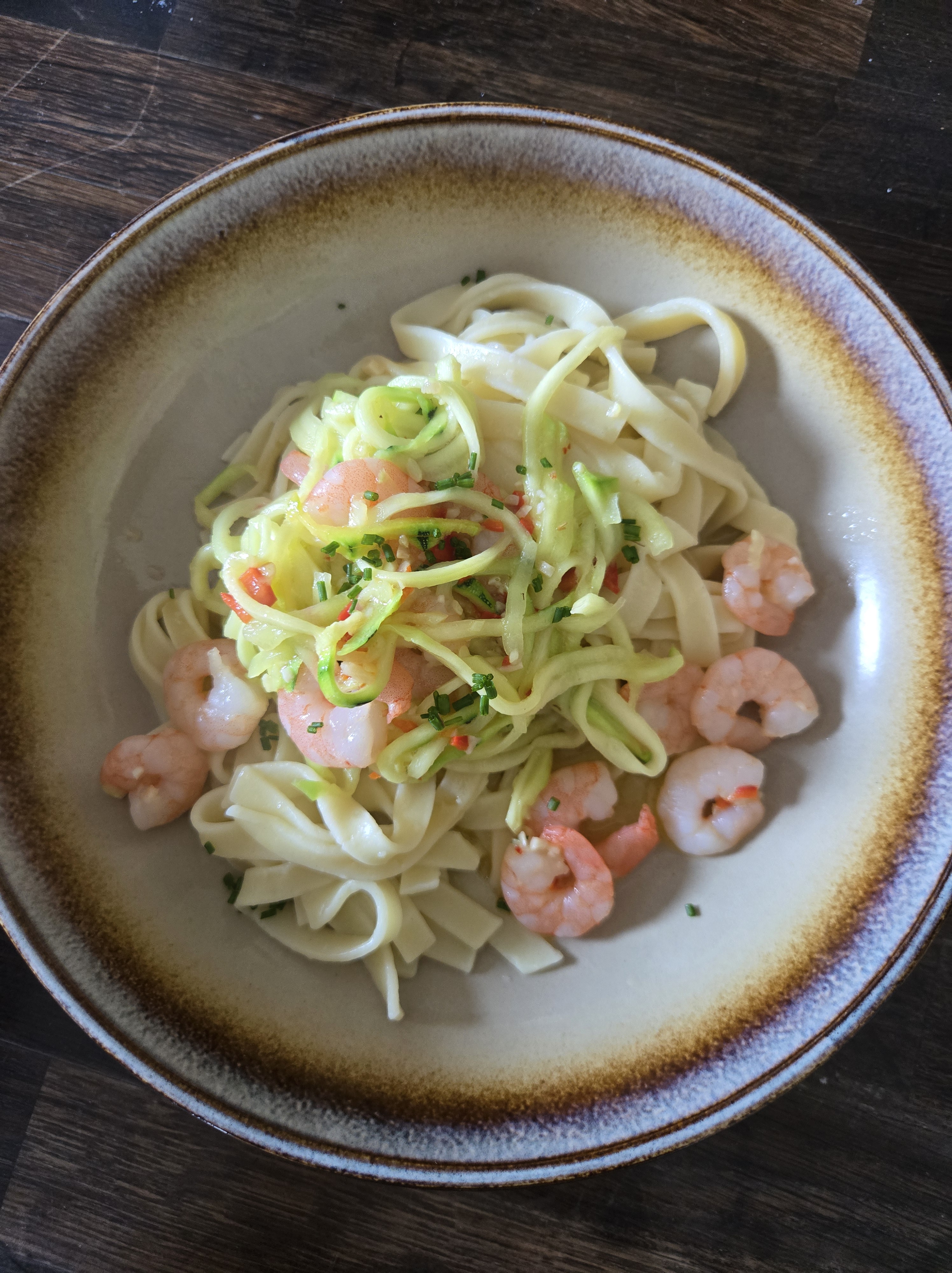 DRAIN OFF THE TAGLIATELLE AND ADD TO THE SERVING BOWLS AND THEN POUR OVER THE PRAWN COURGETTI. SPRINKLE OVER SOME CHOPPED CHIVES TO FINISH AND ENJOY!