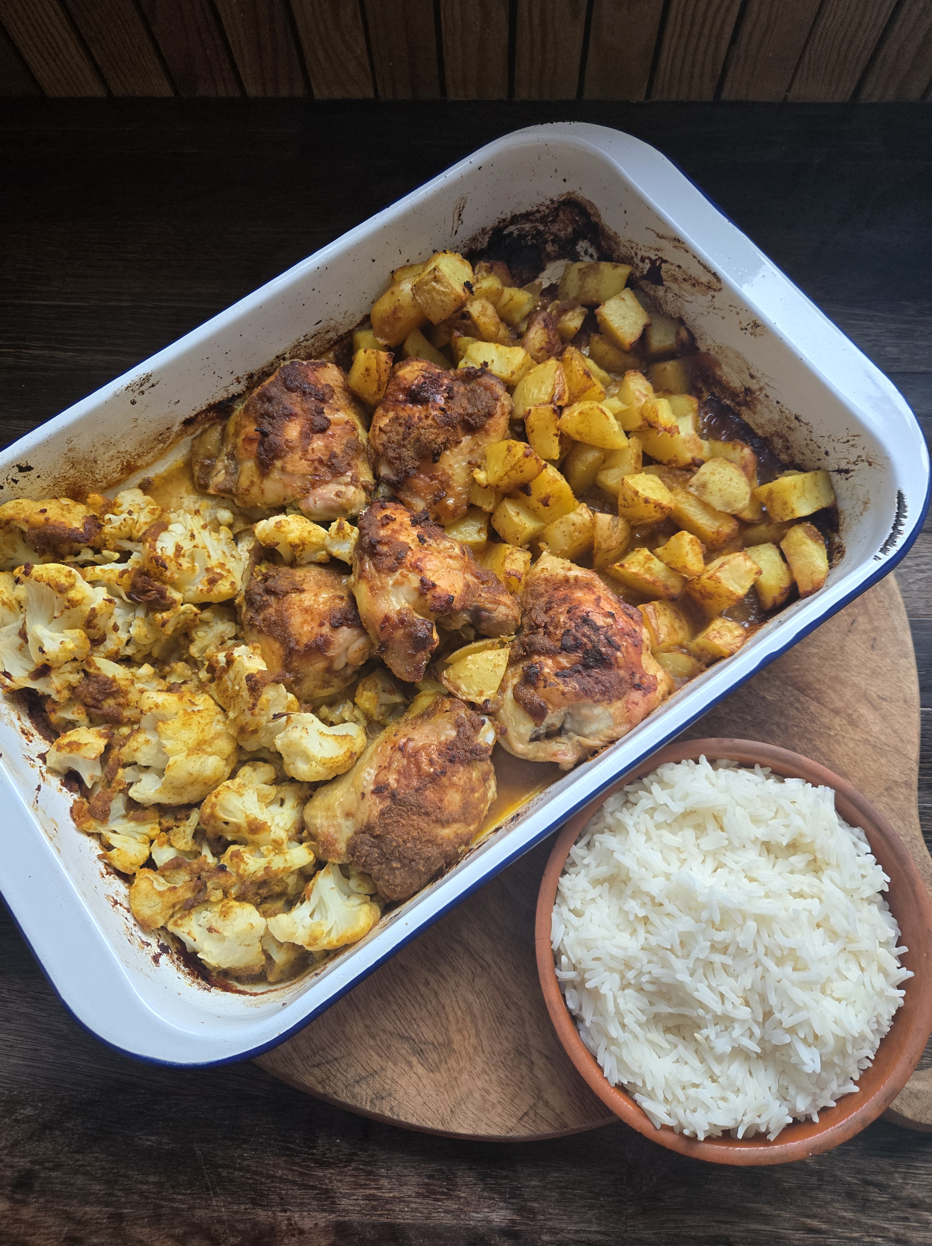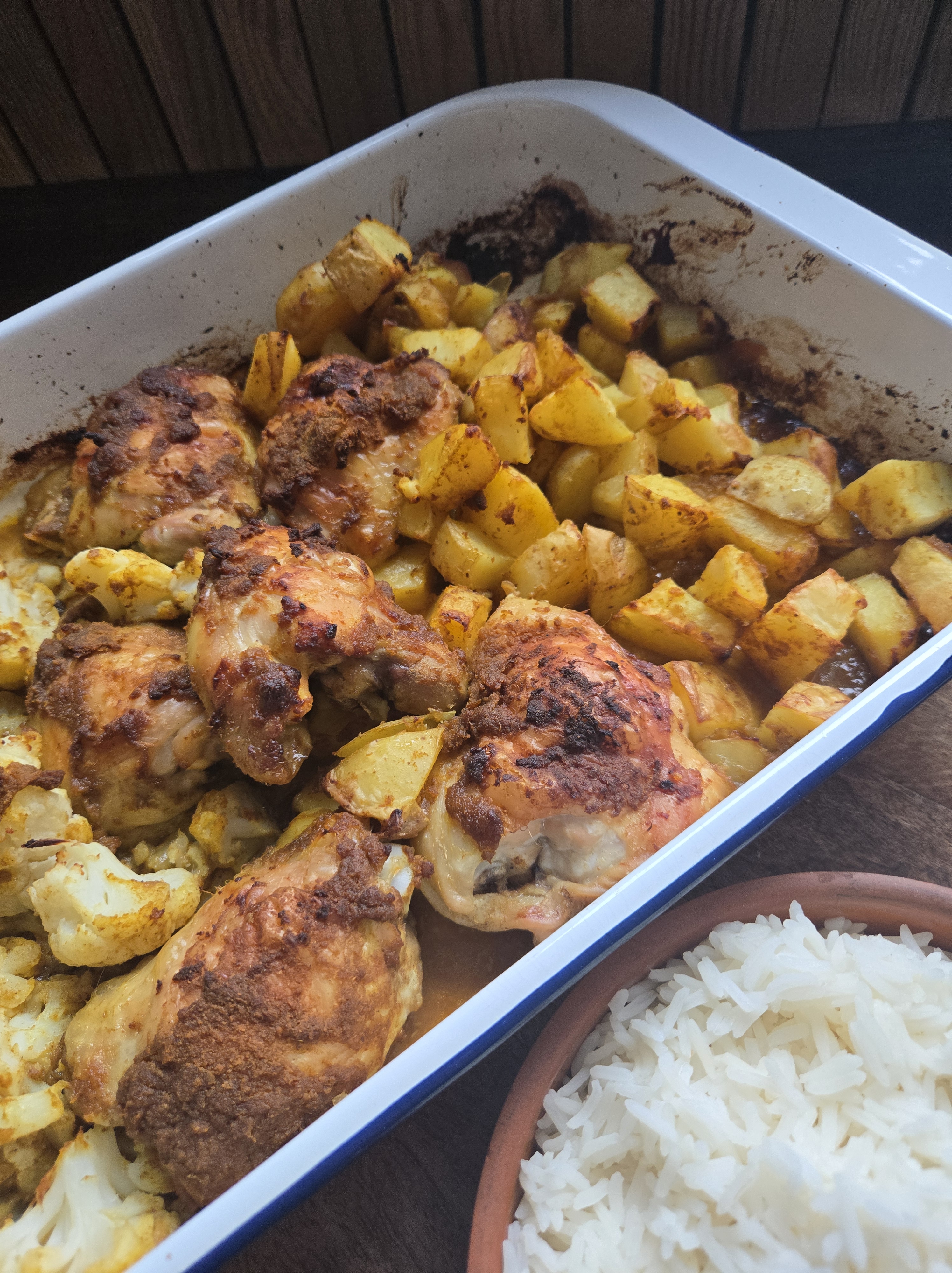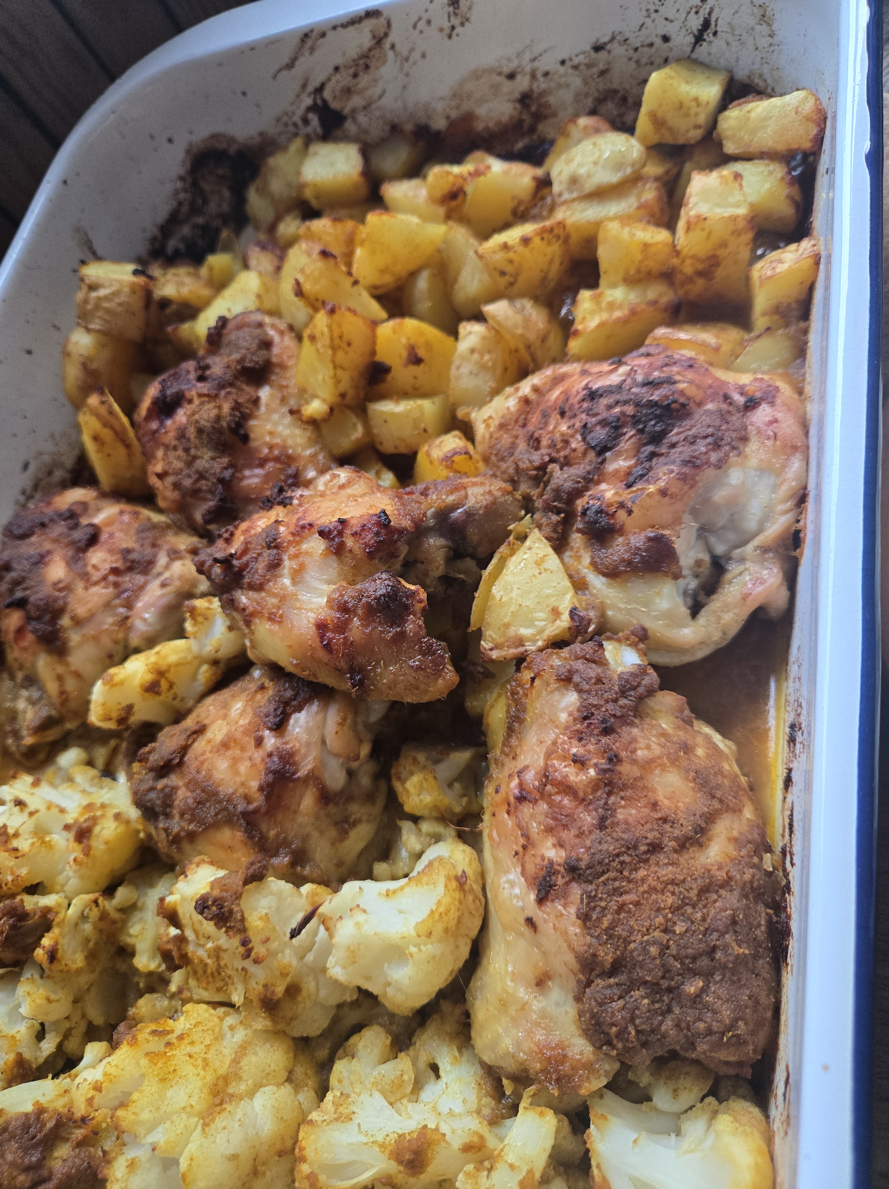AFTER 10 MINUTES DRAIN THE POTATOES AND THE CAULIFLOWER AND ADD THEM INTO THE DISH. USE THE REMAINING MIX PASTE TO COVER THE POTATOES AND THE CAULIFLOWER. COOK FOR A FURTHER 20-30 MINUTES UNTIL THE CHICKEN IS FULLY COOKED